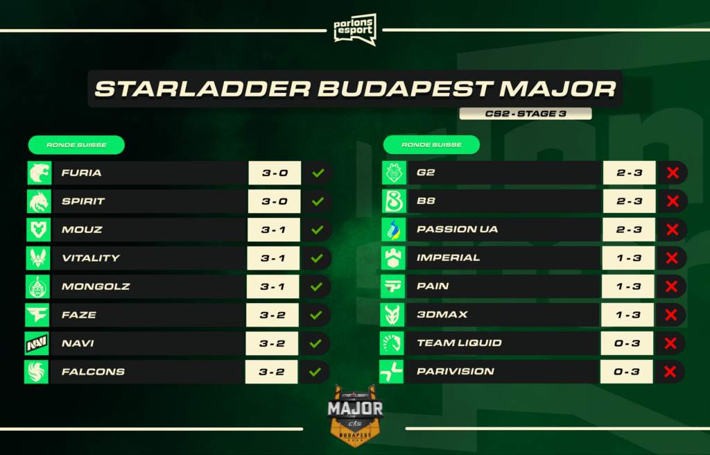 La fin du tournoi approche et avec elle l’arrivée des favoris. C’est donc à partir du 4 décembre que vous pourrez voir Vitality, Team Spirit, Falcons, G2 Esports et tant d’autres équipes s’affronter pour gagner le Starladder Major de Budapest. On arrive maintenant au stage 3 où les 8 équipes sortantes du stage 2 sont rejointes par les 8 équipes qualifiées grâce à leurs points VRS : points gagnés durant l’année en cours dus aux victoires lors des précédentes compétitions.